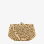 Embrace the flow of elegance with The Gilded Cascade Clutch. Its surface, adorned with undulating wave-like patterns of shimmering crystals, creates a mesmerizing effect of movement and light. The crystal-encrusted arched handle completes this masterpiece, making it the ultimate accessory for your most celebrated evenings.